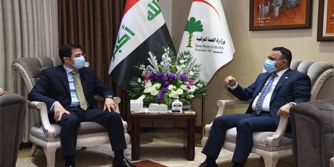 وعقد الوزيران جلسة مباحثات في مبنى وزارة الصحة والبيئة العراقية ناقشا خلالها أهمية التعاون في مكافحة التصدي لجائحة كورونا وتأمين اللقاحات اللازمة للحد من تفشيها.