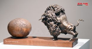 المعرض الذي تستضيفه صالة تجليات ضمن فعاليات احتفالية أيام التشكيل السوري ضم 23 منحوتة بخامتي البرونز والخشب وبثيمة أساسية تشكل علاقة الثور بالكرة التي ترمز للصراع حول مفهوم البقاء.
