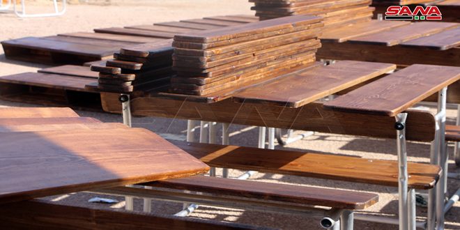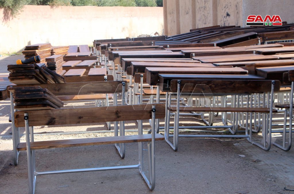 درعا-سانا لتعويض النقص في المقاعد المدرسية التي خربت جراء الإرهاب بمحافظة درعا يعمل معلمو الحرف …