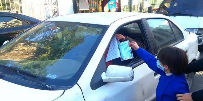 رسالة محبة وتوعية حاول أطفال معهد التربية الخاصة لتأهيل المكفوفين إيصالها اليوم عبر توزيع رسالة توعوية مكتوبة بطريقة “بريل” مع كمامة للمارة وسائقي السيارات في منطقة المزة.