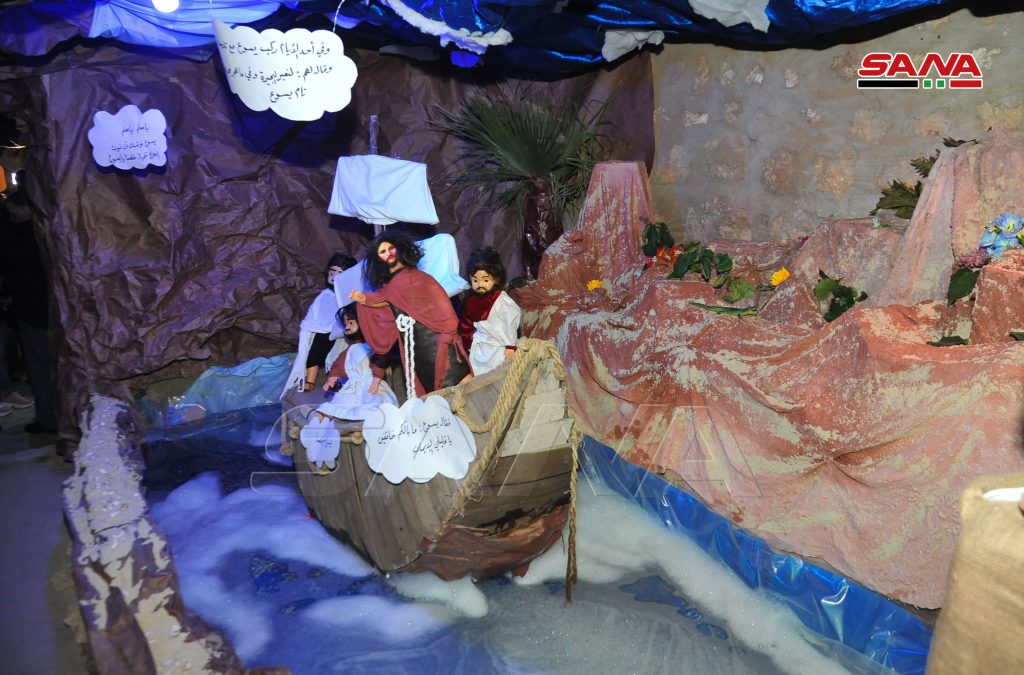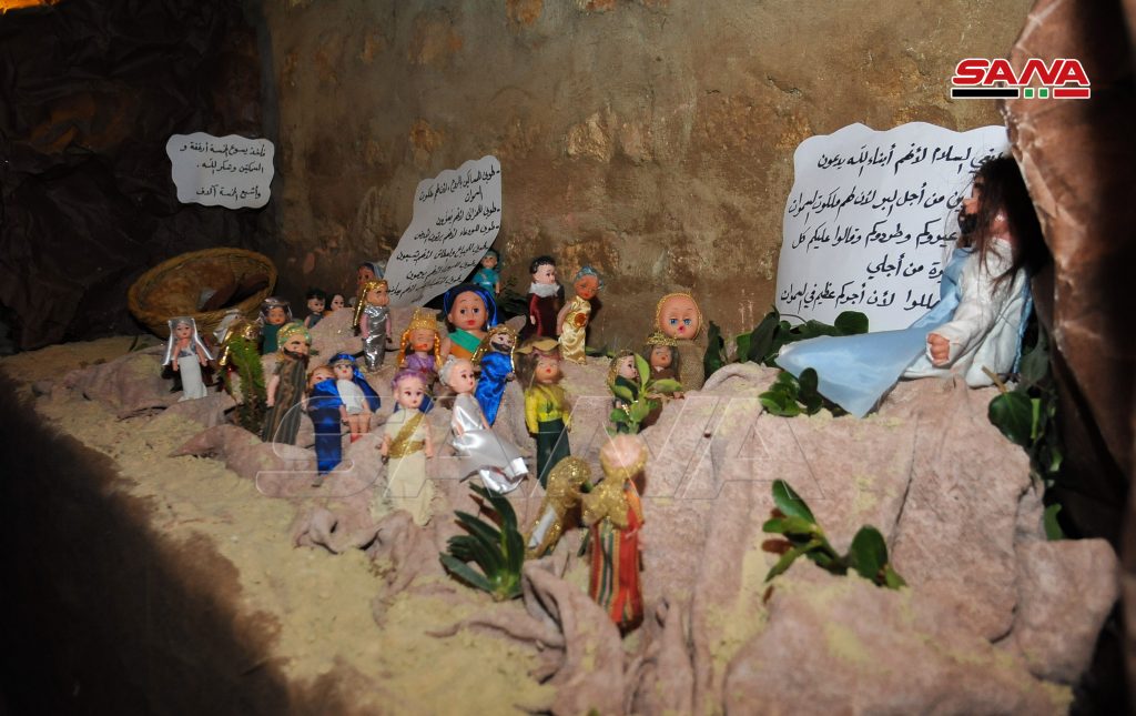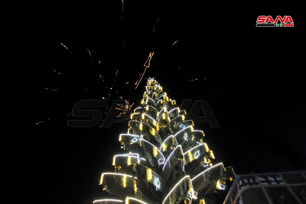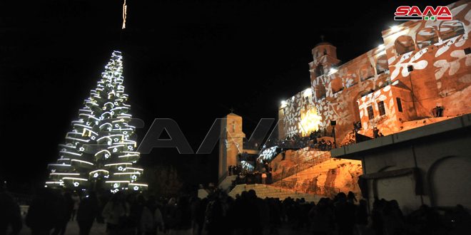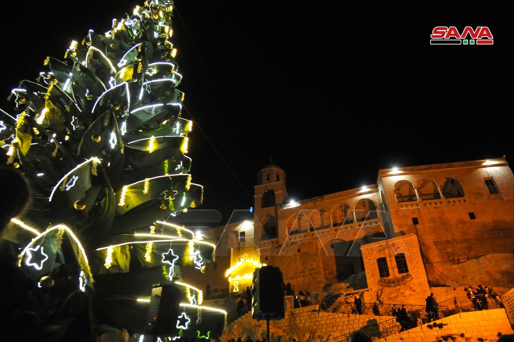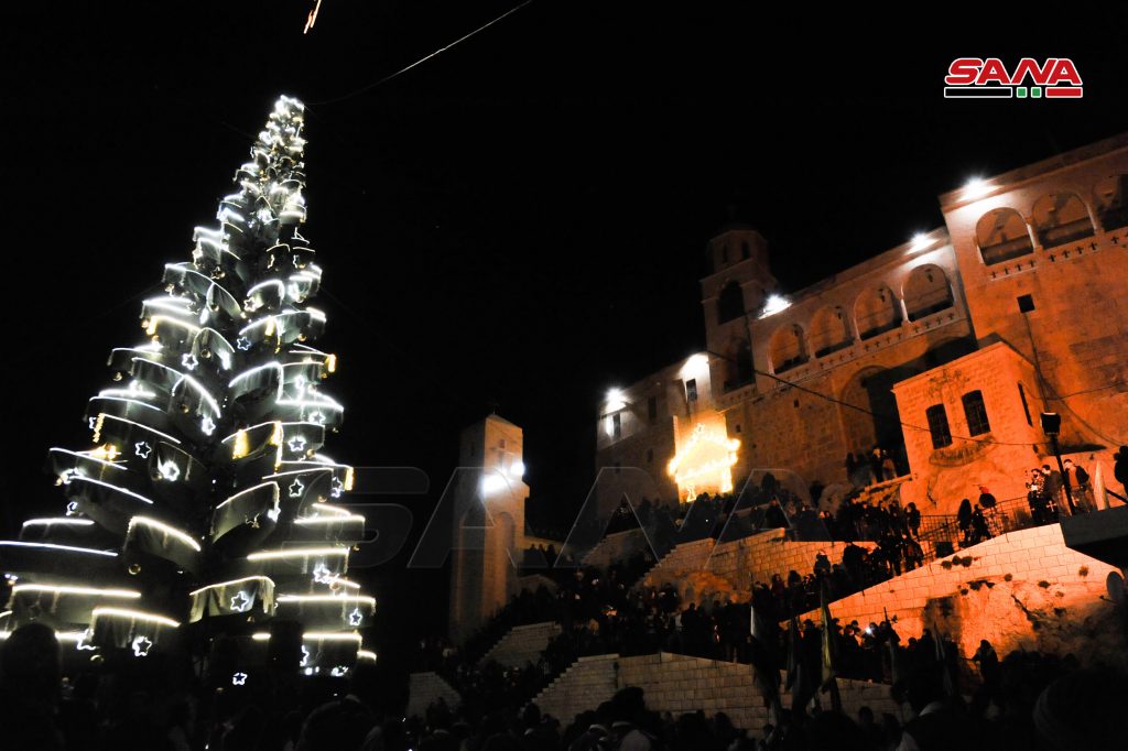 وسط أجواء احتفالية شهدت ساحة دير السيدة بصيدنايا في ريف دمشق مساء اليوم إضاءة شجرة الميلاد بارتفاع 33 مترا تلاها افتتاح مغارة ميلادية على مساحة 400 متر مربع .