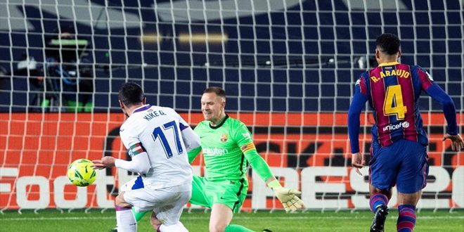 عانى برشلونة في غياب قائده المصاب ليونيل ميسي ليتعادل 1-1 على أرضه أمام ضيفه إيبار في دوري الدرجة الأولى الإسباني لكرة القدم في لقاء شهد إهدار مارتن بريثويت ركلة جزاء للفريق الكتالوني اليوم.