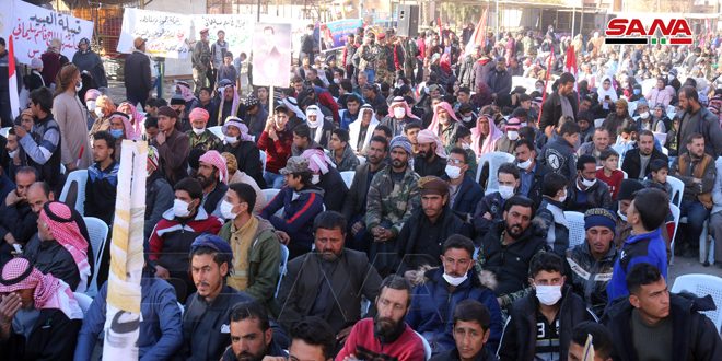 من جهته الشيخ عبد الكريم الدندل لفت في كلمة عشائر دير الزور إلى أن سورية وحلفاءها كانوا وسيظلون المدافعين عن الحق في مواجهة العدوان والطغيان الصهيوامريكي.