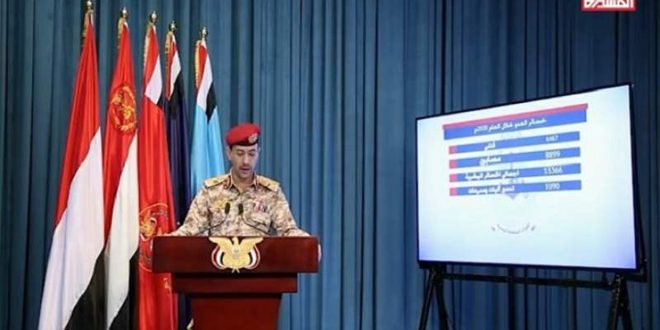 وقال “إن إجمالي ما تم رصده من خسائر بشرية للعدو بلغ أكثر من 15366 ما بين قتيل ومصاب منهم 6467 قتيلاً وأكثر من 8899 مصاباً فضلاً عن تكبد العدو خسائر في العتاد وتم توثيق خسائر العدو في العتاد بأكثر من 1090 ما بين آلية ومدرعة ودبابة وجرافة جرى تدميرها وإعطابها من قبل الوحدات العسكرية في قواتنا المسلحة”.
