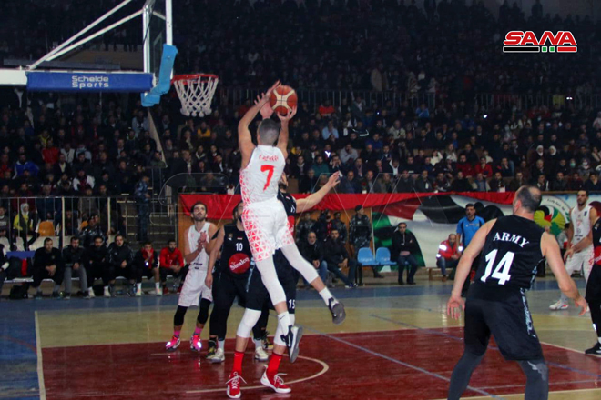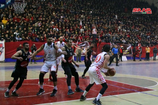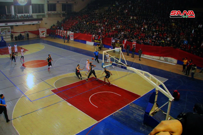 من مباراة فريقي الاتحاد والجيش بكرة السلة في صالة الأسد الرياضية