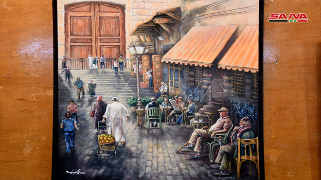 الفنان التشكيلي أحمد شما أوضح أنه اختار لوحة عن أحد أحياء دمشق القديمة وللباب الغربي في الجامع الأموي وقهوة النوفرة حيث يشكل هذا المكان مادة توثيقية حقيقية للواقع الدمشقي وكأنها صورة فوتوغرافية قدمها بلوحة تشكيلية.