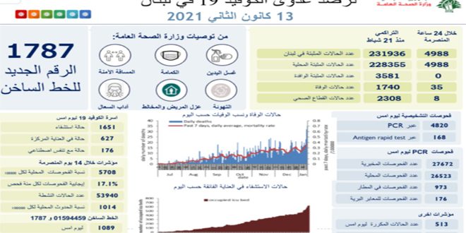 أعلنت وزارة الصحة اللبنانية تسجيل 4988 إصابة جديدة بفيروس كورونا و35 وفاة ناجمة عنه في أعلى معدل وفيات منذ انتشار الفيروس في شباط الماضي.
