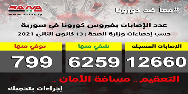 وأوضحت الوزارة في بيان تلقت سانا نسخة منه أن حصيلة الإصابات المسجلة في سورية بلغت حتى الآن إلى 12660 شفيت منها 6259 حالة وتوفيت 799.
