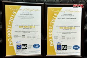 تسلمت مديرية صحة ريف دمشق ومشفيا قطنا والقطيفة الوطنيان اليوم شهادة “الآيزو” 2015: 9001 المتعلقة بتطوير العمل الطبي وتقديم الخدمات بأفضل جودة.