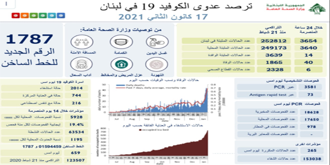 أعلنت وزارة الصحة العامة اللبنانية عن تسجيل 40 وفاة و3654 إصابة جديدة بكورونا خلال الأربع والعشرين ساعة الماضية.