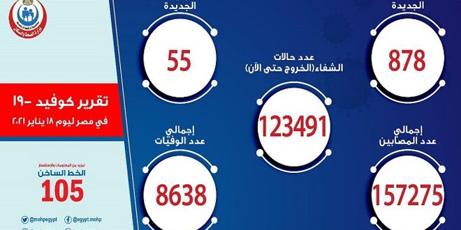 أعلنت وزارة الصحة والسكان المصرية تسجيل 878 إصابة جديدة و55 حالة وفاة بفيروس كورونا خلال الساعات الأربع والعشرين الماضية.