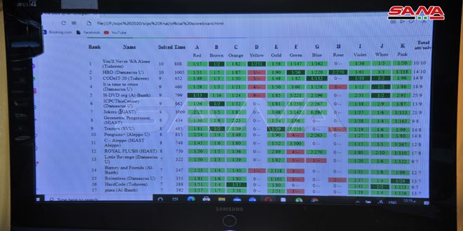 انفرد فريق (يو ويل نيفر رونغ آنسر ألون) الذي ضم الطلاب ربيع جوني سنة خامسة هندسة معلوماتية ومحمود عليو سنة خامسة هندسة حاسبات ومحمد ادريس سنة رابعة طب بشري بالصدارة بعد أن حقق الفريق المركز الأول والميدالية الذهبية بجدارة متفوقاً على فريق جامعة دمشق الذي حل ثانياً بفارق الزمن المستغرق وعدد المحاولات لحل المسائل المطروحة فيما جاء فريق (كودايت 20) المؤلف من الطلاب خالد فرحات سنة ثالثة هندسة معلوماتية ووائل مشنتف سنة ثانية هندسة معلوماتية واوس عيسى طالب سنة ثانية طب بشري في المركز الثالث بميدالية فضية ليضمنا تأهلهما إلى جانب 11 فريقاً من مختلف الجامعات السورية للمشاركة في المسابقة الإقليمية المقرر عقدها في مدينة الأقصر المصرية بين الـ 19 والـ 28 من آذار المقبل.