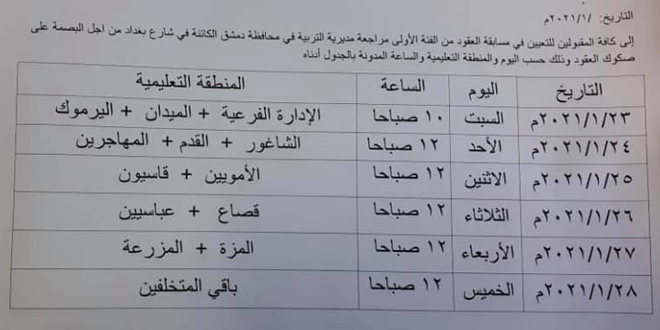 طلبت مديرية تربية دمشق من جميع المقبولين في مسابقة العقود الفئة الأولى “الدفعة الأولى” مراجعة مبناها الكائن في شارع بغداد للمباشرة بتوقيع صكوك عقودهم.