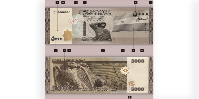 أعلن مصرف سورية المركزي عن طرح الفئة النقدية الجديدة 5000 ليرة سورية في التداول جنباً إلى جنب مع باقي الفئات النقدية المتداولة حالياً اعتباراً من تاريخ اليوم الـ 24 من كانون الثاني مبيناً أن الوقت أصبح ملائماً لذلك وفق المتغيرات الاقتصادية الحالية.