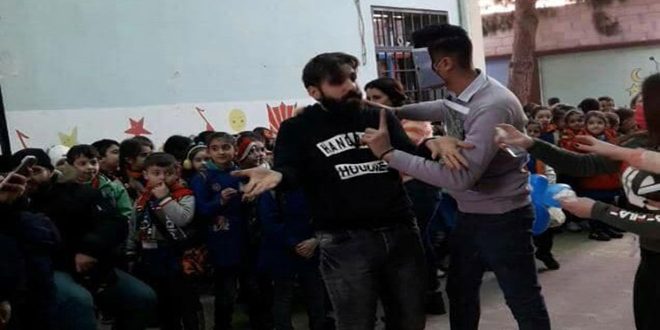 مجموعة من الطلبة المتميزين من أعضاء فريق (مواهب جامعية) تمكنوا مؤخراً من استثمار علومهم الأكاديمية في صناعة عرض مسرحي يحمل طابعاً تثقيفياً توجهوا من خلاله إلى طلاب الصفين الأول والثاني في مدرسة (عكرمة المخزومي) في حمص لتوعيتهم بسبل الوقاية من فيروس كورونا المستجد.