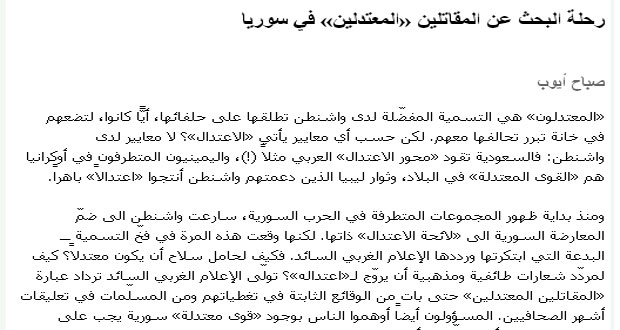 وتابع الكاتب أن “الإعلام الغربي السائد تولى ترديد عبارة /المقاتلين المعتدلين/ حتى بات من الوقائع الثابتة في تغطياتهم ومن المسلّمات في تعليقات أشهر الصحفيين والمسؤولين وأوهموا الناس بوجود “قوى معتدلة” سورية يجب على الولايات المتحدة أن تسلّحها فأين هم ما اسمهم ما هي مبادؤهم” لافتا إلى أن “واشنطن وضعت ما يسمى “الجيش الحر” منذ سنوات في واجهة “المعتدلين” لكن سرعان ما تفكك وتطرف بعضه أو عاد بعضه الآخر إلى صفوف الجيش السوري”.