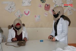 هنادي العاصي مدرسة في الثانوية قالت “نبذل جهوداً متواصلة حتى في أيام العطل لخياطة 25 ألف كمامة وأنجزنا نحو 5000 كمامة حتى الآن” مشيرة إلى أن الكادر المشارك أمضى نحو أسبوعين في قص القماش وتجهيزه.