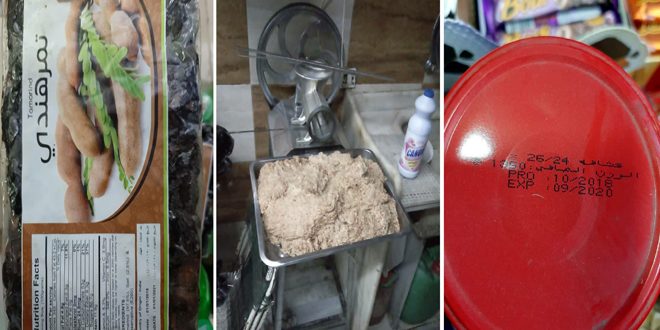 ضبطت عناصر مديرية التجارة الداخلية وحماية المستهلك بدمشق مواد منتهية الصلاحية ومحال تبيع لحوماً مفرومة بشكل مسبق.