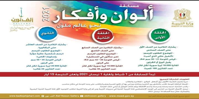ويستمر قبول الأعمال في المسابقة التي تقيمها صالة ألف نون للفنون والروحانيات بالتعاون مع وزارة التربية تحت عنوان نحو عالم ملون حتى الأول من شهر نيسان القادم حيث يلتزم طلاب الحلقة الاولى من مرحلة التعليم الأساسي برسم موضوع بعنوان اتخيل عالمي الذي أحب مع كتابة جملة معبرة على وجه اللوحة ولهم حرية اختيار التقنية والألوان المستخدمة ويفوز عن هذه الفئة 100 مشارك ينال كل منهم مبلغ عشرة ألاف ليرة سورية.