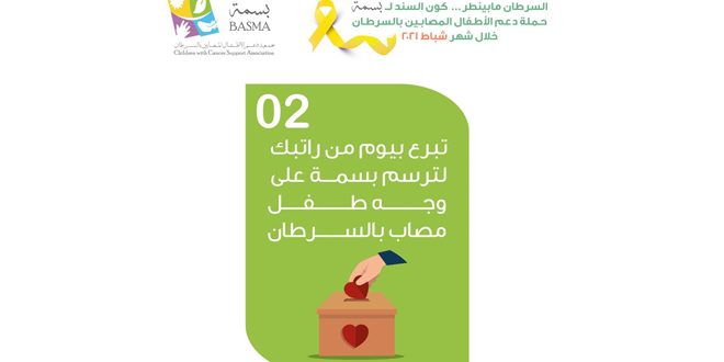 أطلقت جمعية بسمة لدعم الأطفال المصابين بالسرطان حملتها السنوية لدعم أطفال السرطان مادياً ومعنوياً عبر 28 طريقة وتستمر خلال شهر شباط الذي يصادف منتصفه اليوم العالمي لأطفال السرطان.