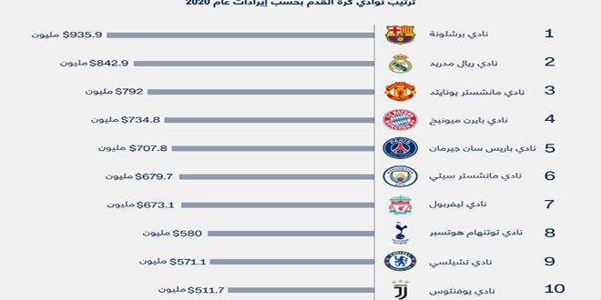وحقق برشلونة إيرادات قياسية بلغت 935.9 مليون دولار الموسم الماضي ونتيجة لذلك تراجع ريال مدريد إلى المركز الثاني برصيد 842.9 مليون دولار بينما بقي مانشستر يونايتد في المركز الثالث برصيد 792 مليون دولار.