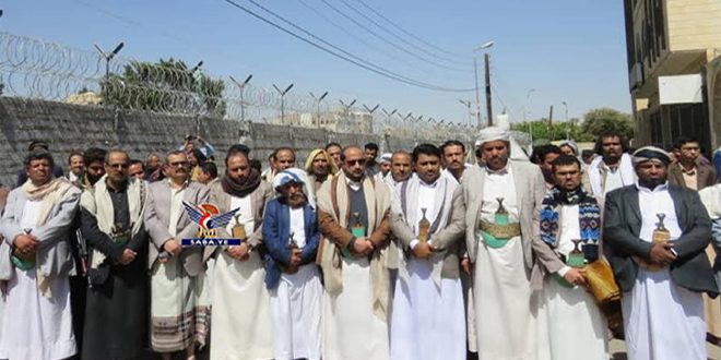 نظم يمنيون وقفة احتجاجية أمام مكتب الأمم المتحدة في العاصمة اليمنية صنعاء اليوم تحت شعار (القرصنة على سفن الوقود جريمة شاملة.. بشراكة أممية كاملة) تنديداً باستمرار احتجاز تحالف العدوان السعودي سفن المشتقات النفطية.