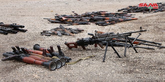 وذكر مصدر في الجهات المختصة لمراسلة سانا أنه “خلال استكمال تمشيط عدد من المزارع المحررة من الإرهاب الواقعة على الحدود الإدارية بين محافظتي درعا والسويداء بريف درعا الشرقي عثرت الجهات المختصة على كميات من الأسلحة والذخائر والقذائف من مخلفات التنظيمات الإرهابية”.