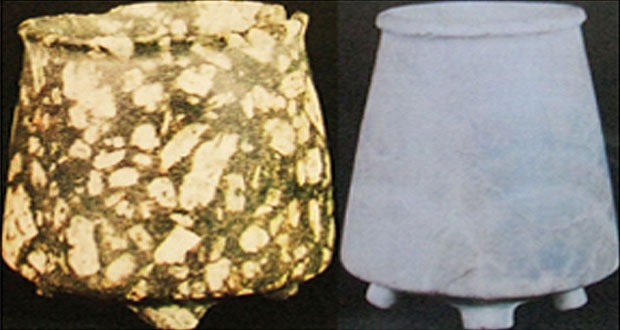 وأضاف السيد أن الكأسين صنعا وفق تقنية تشكيل وتجويف الحجر حتى يأخذ الإناءان شكلهما الأساسي ثم تم شحذ الإناءين من الداخل عن طريق استعمال أدوات الصقل الحجرية والتنعيم بالرمل ثم تم تهذيب سطح الإناءين وصقلهما وقد ساهم أسلوب الصقل والتلميع بدقة و مهارة على سطحهما بإظهار عروق الرخام الملونة علما أن نحت الأواني الرباعية القوائم ذات الفوهات العالية قد تم من خلال استخدام مثاقب على شكل عيدان الكبريت مصنوعة من حجر الصوان.