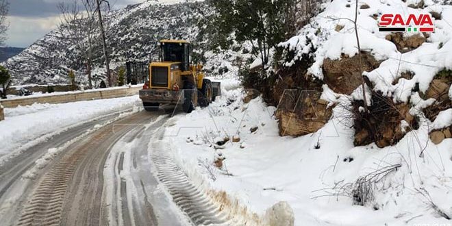 استمرار عمليات فتح الطرق التي أغلقتها الثلوج بريف حمص الغربي