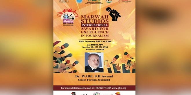 حاز الصحفي السوري الدكتور وائل عواد مراسل وكالة سانا في الهند جائزة “استديو مروى” العالمية للتميز في الصحافة وذلك خلال حفل أقيم عبر شبكة الانترنت السبت الماضي.