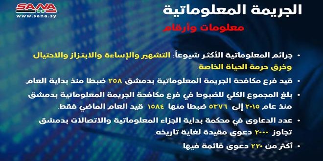وتيرة العمل في هذا السياق تسجل حركة ملحوظة بهدف مكافحة الجريمة المعلوماتية وفق حصيلة رصدتها سانا حيث قيد فرع مكافحة الجريمة المعلوماتية بدمشق 258 ضبطاً منذ بداية العام الحالي كما بلغ المجموع الكلي للضبوط منذ عام 2015 -5376 ضبطاً منها 1584 ضبطا قيد العام الماضي بينما سجلت محكمة بداية الجزاء المعلوماتية والاتصالات أكثر من 220 دعوى قائمة أغلبها وقعت بجرم التشهير والإساءة والابتزاز وخرق حرمة الحياة الخاصة.