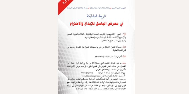 وأوضحت وزارة التجارة الداخلية وحماية المستهلك في بيان تلقت سانا نسخة منه أن اللجنة أقرت قيمة الجوائز التي ستقدم للفائزين من المخترعين والمبدعين الذين يحصلون على المراتب الثلاث الأولى بعد التقييم العلمي لاختراعاتهم من لجنة علمية مختصة في معرض الباسل للإبداع والاختراع بدورته العشرين والذي سيقام بين 28-8 إلى 2-9-2021.