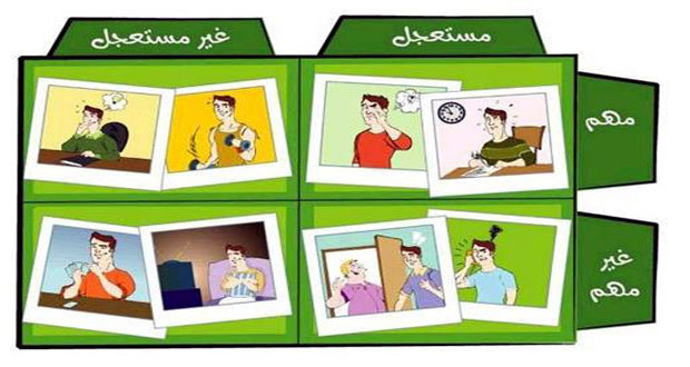وللتعرف على ما يسمى “نتائج إدمان الطوارئ والعاجل من الأمور” ترى تسابحجي أنه يجب إعداد جدول لإدارة الوقت حسب الطوارئ والأهمية نضع في المربع الأول الأمور المهمة التي اصبحت عاجلة لتأجيلها وإهمالها لأننا لم نعد لها ما يكفي من التخطيط الوقائي فيما يحتوي المربع الثاني أمورا مهمة ولكنها ليست ملحّة فهو مجال تخطيط طويل الأجل حيث نتوقع المشكلات ونحاول منع حدوثها كعملية وقائية قبل أن نصل إلى المرض الذي يمثله المربع الأول ولذلك فإن المربع الثاني يسمى “مربع الجودة”.
