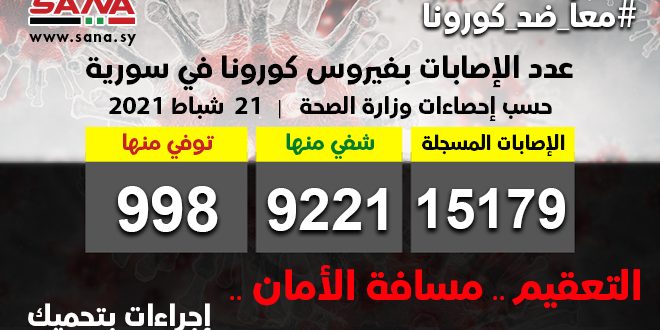 وأوضحت الوزارة في بيان تلقت سانا نسخة منه أن عدد الإصابات المسجلة في سورية بلغ حتى الآن 15179 شفيت منها 9221 وتوفيت 998 حالة.