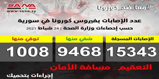 وأوضحت الوزارة في بيان تلقت سانا نسخة منه أن عدد الإصابات المسجلة في سورية بلغ حتى الآن 15343 شفيت منها 9468 وتوفيت 1008 حالات.