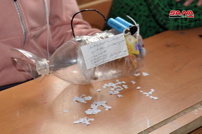 “نسعى لنشر ثقافة استخدام مخلفات البيئة عبر إنجاز مشاريع ذات عائد تعليمي تعتمد على إعادة التدوير وإنتاج مجسمات جديدة لأغراض مفيدة” تقول الطالبة روكسانا نادر لمراسل سانا مبينة أنها وزميلاتها صنعن مجسماً للمنظومة الشمسية من مخلفات البيئة لمساعدة الطلبة على تطبيق الدروس بشكل عملي.