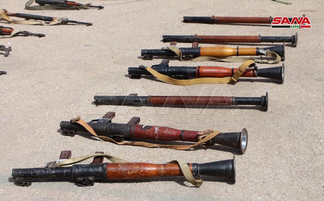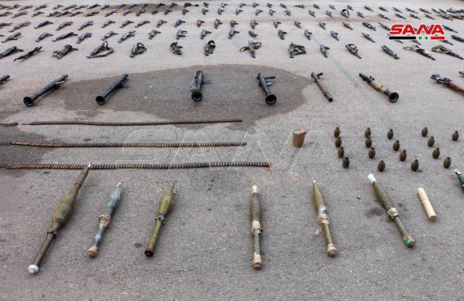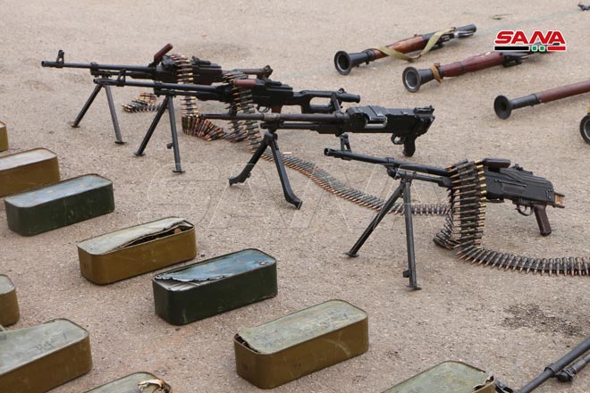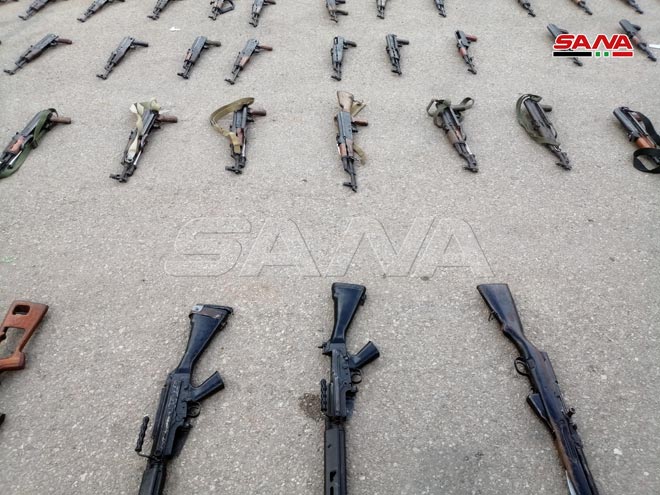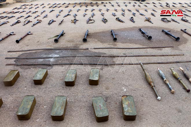 وذكر قائد ميداني لمراسل سانا أنه “أثناء تفتيش المزارع في الريف الغربي من محافظة درعا تم العثور على كمية من الأسلحة والذخائر المتنوعة منها ما كان معداً للتهريب وقسم مجهز للبيع” مشيراً إلى أن ضبط الأسلحة جاء “بفضل التعاون المثمر بين الجهات المختصة والأهالي الشرفاء من أبناء المحافظة”.