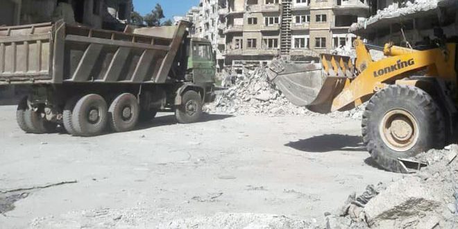 وأشار المهندس حيدر النقري مدير الأشغال في مجلس المدينة في تصريح لمراسلة سانا إلى أنه تتم حاليا إزالة الأسقف والأجزاء المتضررة التي تشكل خطرا على السلامة المرورية والعامة من عدة عقارات في حي وادي السايح بطريقة الهدم الآلي بواسطة القاضمة وعقارات في حي باب الدريب وطريق حماة شارع الرندي وبستان الديوان شارع الإمام مالك بطريقة الهدم اليدوي بالإضافة إلى ترحيل الأنقاض الناتجة عن هدم الأجزاء المتضررة.