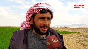 مراسل سانا بتدمر رصد آراء عدد من فلاحي منطقة البيارات الغربية في حقولهم حيث عبر المزارع رياض قشعم عن ارتياحه بعد عودته للمنطقة التي تم تطهيرها من الإرهاب وزراعة أرضه بمحصول القمح بعد حصوله على البذار اللازمة.
