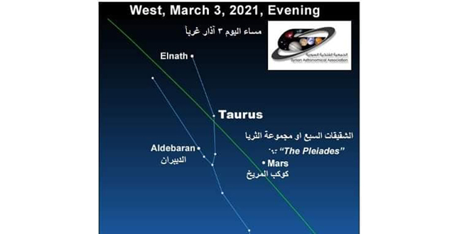 يقترن اليوم الكوكب ذو الوشاح الأحمر المريخ بالشقيقات السبع كوكبة الثريا عند الساعة 26ر01 صباحاً بتوقيت دمشق.