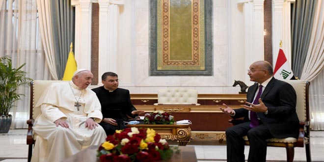 وقال البابا في كلمة له إثر لقائه الرئيس العراقي برهم صالح في قصر بغداد في مستهل زيارة تاريخية له اليوم إلى العراق وفقاً لما نقل موقع السومرية نيوز: على مدى العقود الماضية عانى العراق من كوارث الحروب وآفة الإرهاب ومن صراعات جلبت الموت والدمار وأنا ممتن لإتاحة الفرصة لي لأن أقوم بهذه الزيارة التي طال انتظارها إلى هذه الأرض مهد الحضارة.