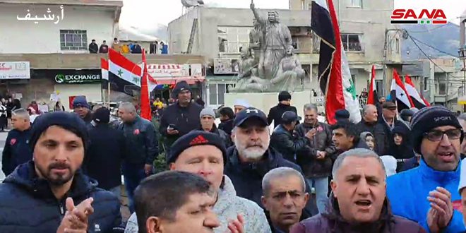 وجدد المشاركون في الوقفة التي أقيمت اليوم على الشارع الرئيس في قرية مسعدة بالجولان المحتل تمسكهم بالهوية العربية السورية والأرض وعدم التنازل عن ذرة تراب منها والدفاع عنها مهما كلف ذلك من تضحيات مؤكدين رفضهم المطلق لكل مخططات الاحتلال التهويدية وفي مقدمتها المخطط الاستيطاني الصهيوني الرامي إلى إقامة “توربينات” على أراضيهم الزراعية ومصادرة ممتلكاتهم بالقوة.