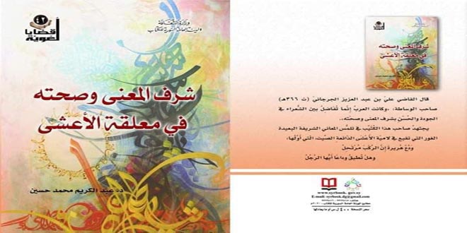 وعبر كتيب حمل عنوان “شرف المعنى وصحته في معلقة الأعشى” يقدم الدكتور عبد الكريم محمد حسين رؤيته في هذه القصيدة بأبياتها الـ 69 موضحاً أن في هذه القصيدة بعدين أحدهما فضاء النص المتكون حول كتلته والآخر في عمق بنيته.
