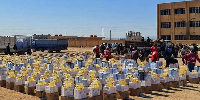 وزع فرع منظمة الهلال الأحمر العربي السوري مساعدات غذائية للأسر الوافدة والمحتاجة في عدد من أحياء مدينة الحسكة.