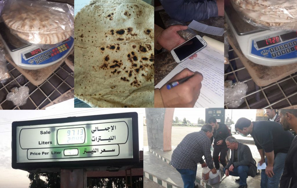 ونظم عناصر مديرية التجارة الداخلية وحماية المستهلك بدرعا خلال أيام الثلاثاء والأربعاء واليوم ضبطاً تموينياً بمخابز تسيل والعجمي والصنمين والمزيريب ونوى بمخالفة نقص في وزن ربطات الخبز وإنتاج خبز سيئ الصنع ومعتمد في بلدة غصم بمخالفة بيع الخبز بسعر زائد.