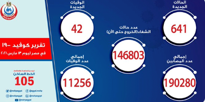 أعلنت وزارة الصحة المصرية تسجيل 42 حالة وفاة و641 إصابة جديدة بفيروس كورونا المستجد.