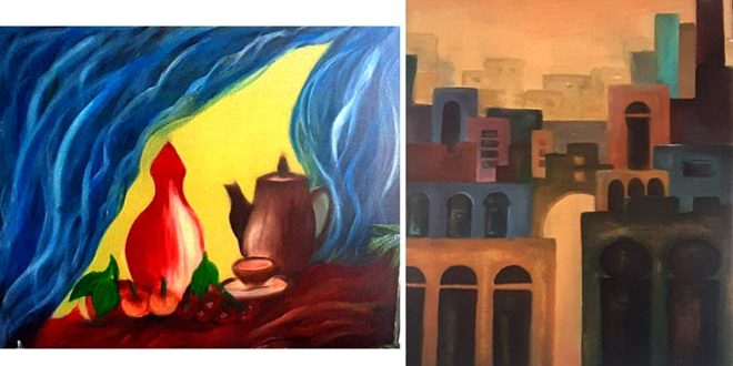 وتضمنت لوحات الفنانة ريم العلي معاني سامية عن الحب في زمن الحرب وعن جمال التراث في البيوت الحمصية القديمة ولونت لوحاتها بالألوان الزيتية والمائية.
