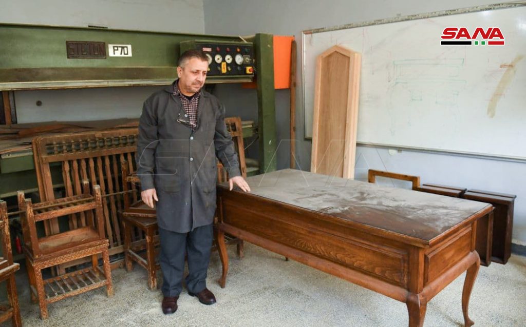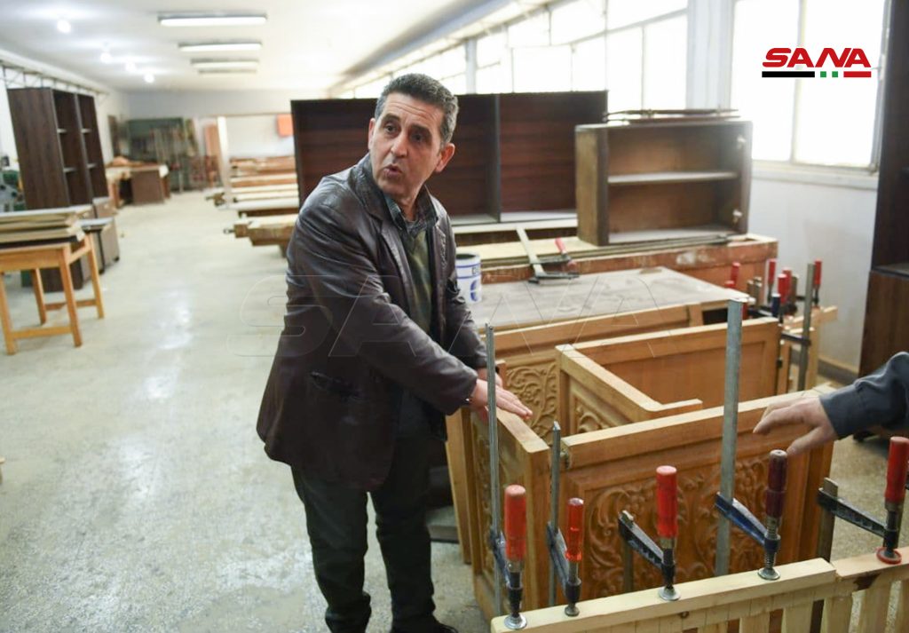 وبين زلف لمراسل سانا أنه بعد تعرض المعهد للتخريب والدمار على يد الإرهابيين تم العمل لإعادة تأهيل ما تضرر من أجزاء المعهد من خلال تجميعها ونقل بعضها لمدرسة التلمذة للتعليم المزدوج ومن ثم العودة لمكان المعهد لإكمال مسيرته التعليمية وإنتاج المقاعد والطاولات المدرسية وتفعيل قسم النسيج وتخريج طلاب متمكنين بحرف النسيج والنجارة.