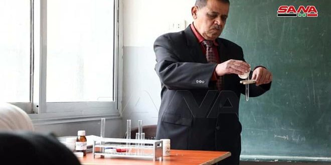 في صفوف إحدى مدارس عدرا البلد بريف دمشق يحاول المربي المعلم محمد جمعة حسين حجلي تبسيط مبادئ الفيزياء والكيمياء لطلاب سنته التدريسية الأخيرة فمعهم سينهي مسيرة امتدت لأكثر من 35 عاماً.