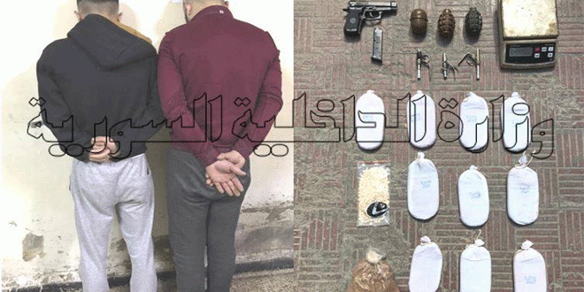 وذكرت وزارة الداخلية في بيان تلقت سانا نسخة منه اليوم أنه بناء على معلومات وردت إلى فرع مكافحة المخدرات بريف دمشق حول وجود شخصين في أحد أحياء جرمانا يقومان بترويع المواطنين وترويج المخدرات في الحي ومن خلال المتابعة والمراقبة المستمرة تمكن فرع مكافحة المخدرات من إلقاء القبض عليهما بكمين محكم.